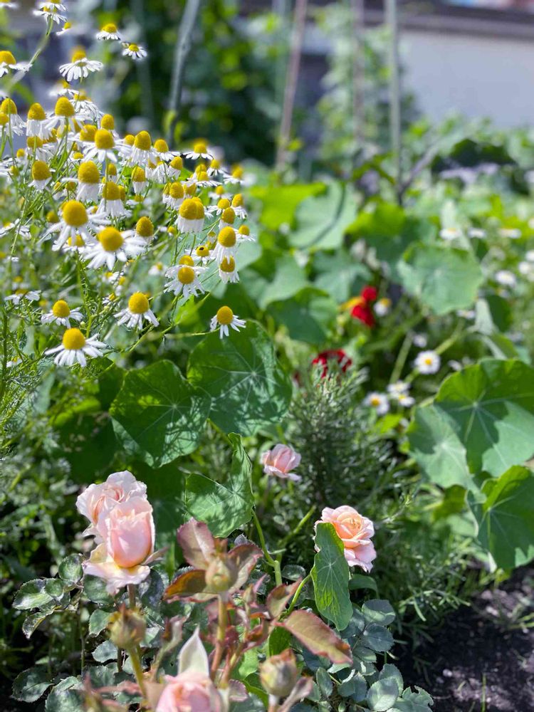 ローズマリーとカモミール、そしてナスタチウムに守られるように新芽が伸びて可愛い花が咲きました✨
