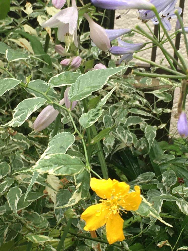ここのシマ、ヤマブキの葉とその下のギボウシからの花、隣の増殖中のアガパンサスで収拾がつかない状態😅