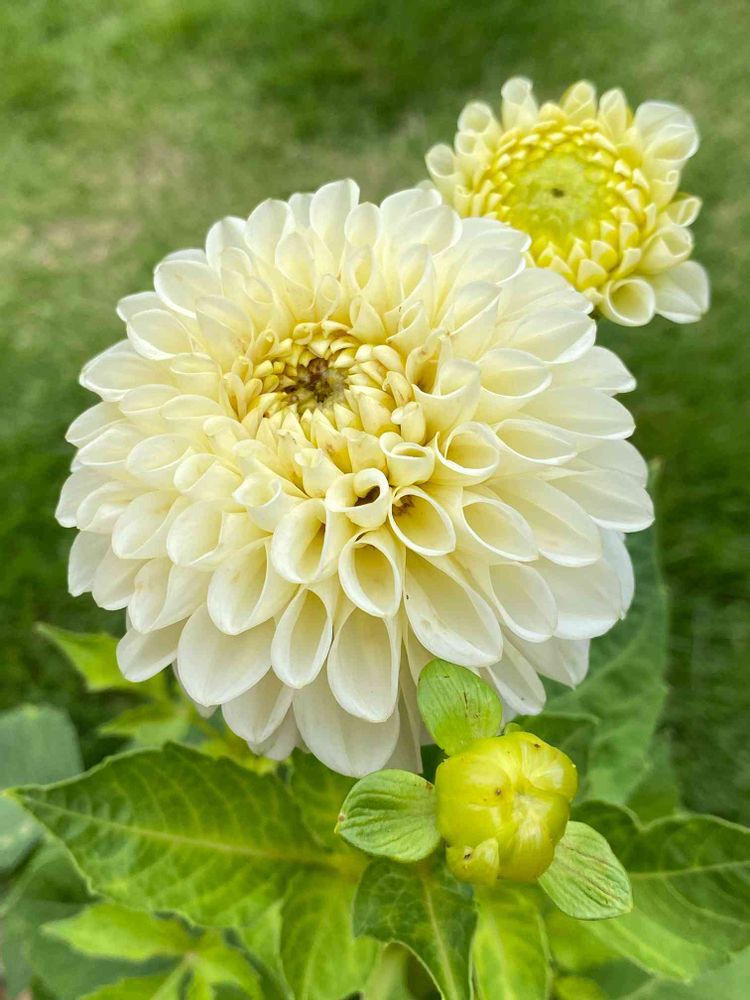 白いポンポンダリアが大きなお花を咲かせました^_^赤、黄、桃の球根セットでしたが、残念なことに桃だけ発芽しません😊