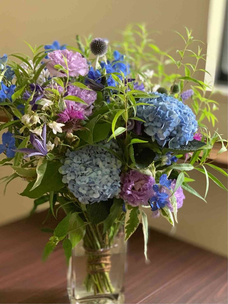 ブルーカラーは普段あまり作らないので、とても新鮮でした!この時期、爽やかな気分になりますね。ラッピングも紺色にしたら花色が映えて豪華になりました。