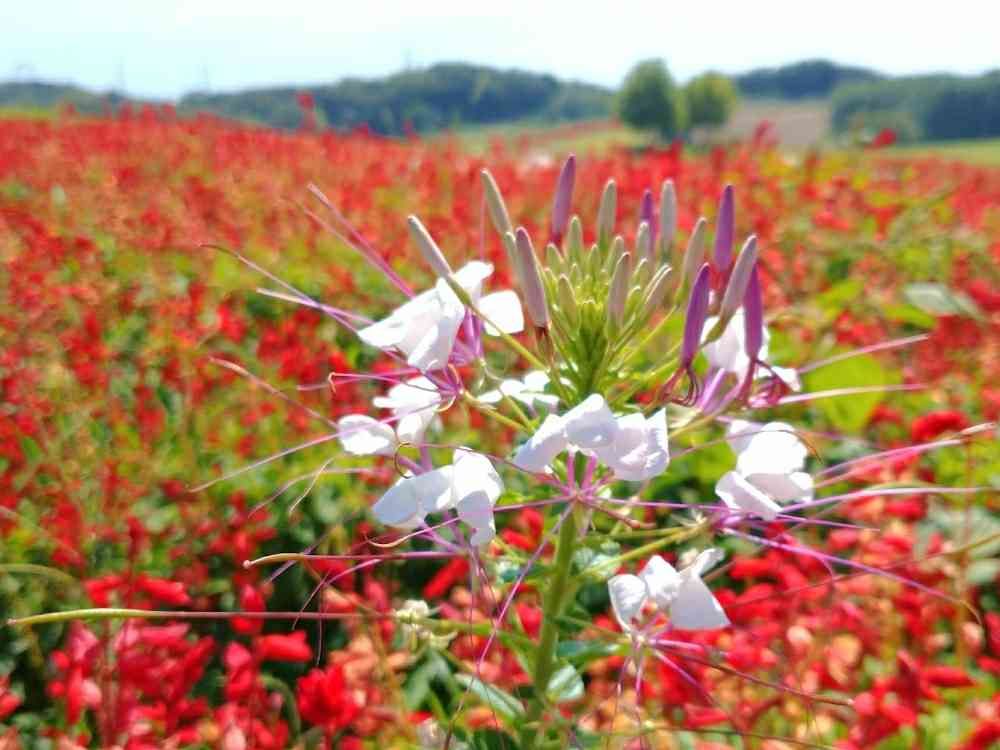 真っ赤なサルビア畑を背景にクレオメって組み合わせ…なかなか無いかなぁと思って🆙しました👌