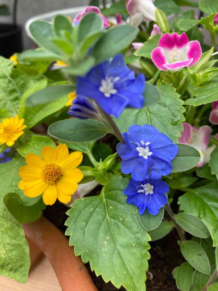 明るい黄色とアメリカンブルーとどれも小さくて夏いっぱいの寄植えの花です♪🎶