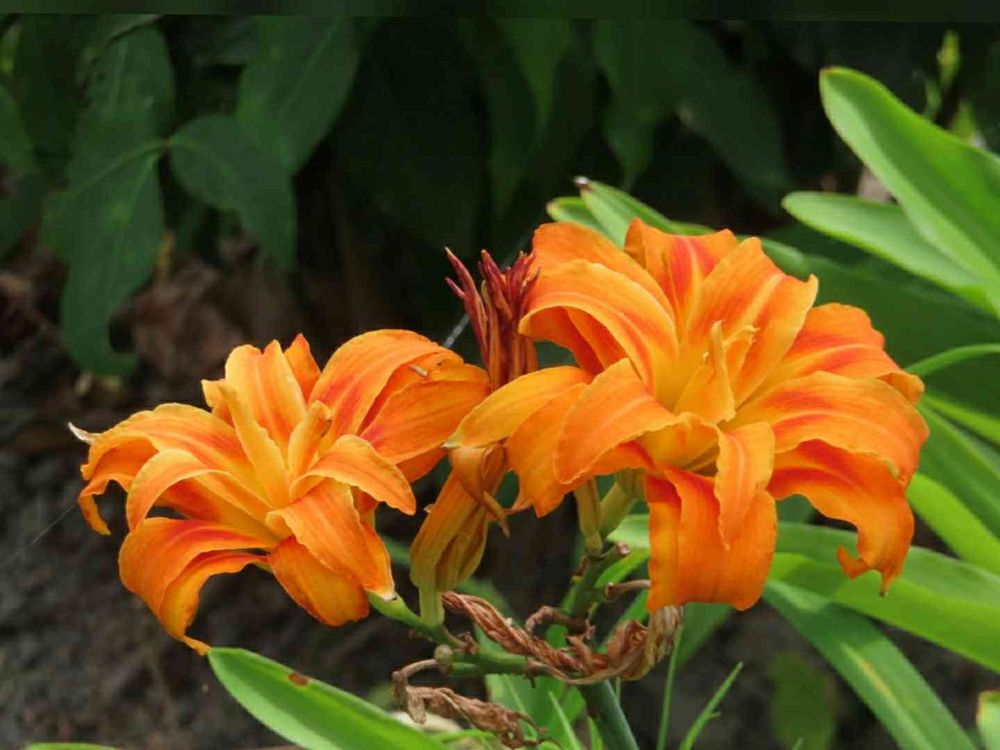 籔萱草(ヤブカンゾウ)、別名忘れ草(ワスレグサ)はユリ科ワスレグサ属(ヘメロカリス属)。7~8月にオレンジ色の赤っぽく大きい八重の百合様の花が咲く。花びらはややくしゃくしゃっとした感じ。野萱草(のかんぞう)はよく似ているが一重咲き。別名のワスレグサ(忘れ草)は花が一日限りで終わると考えられたため、英語ではDaylilyと呼ばれる。実際には翌日や翌々日に閉花するものも多い。