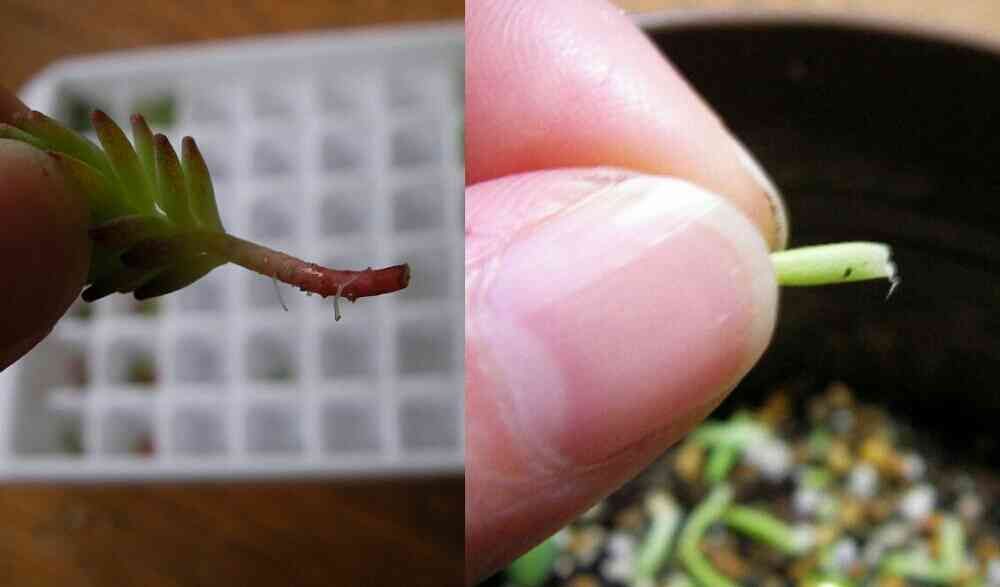 4/1に水挿ししたゴールドビューティーから取った下葉を、湿った土布団に置いておいたものが発根(右)、4/3に水挿ししたパリダムから3日目で発根(左)、パリダムは茎の途中からいくつも出てきました。ちっちゃい根が見えるかなー?