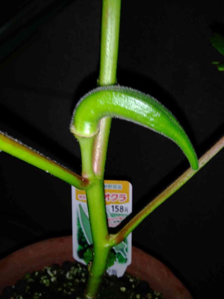 育てていた白オクラが実りました。しかし曲がっている。オクラが曲がる原因は水不足や虫害などいろいろあるらしいですが。