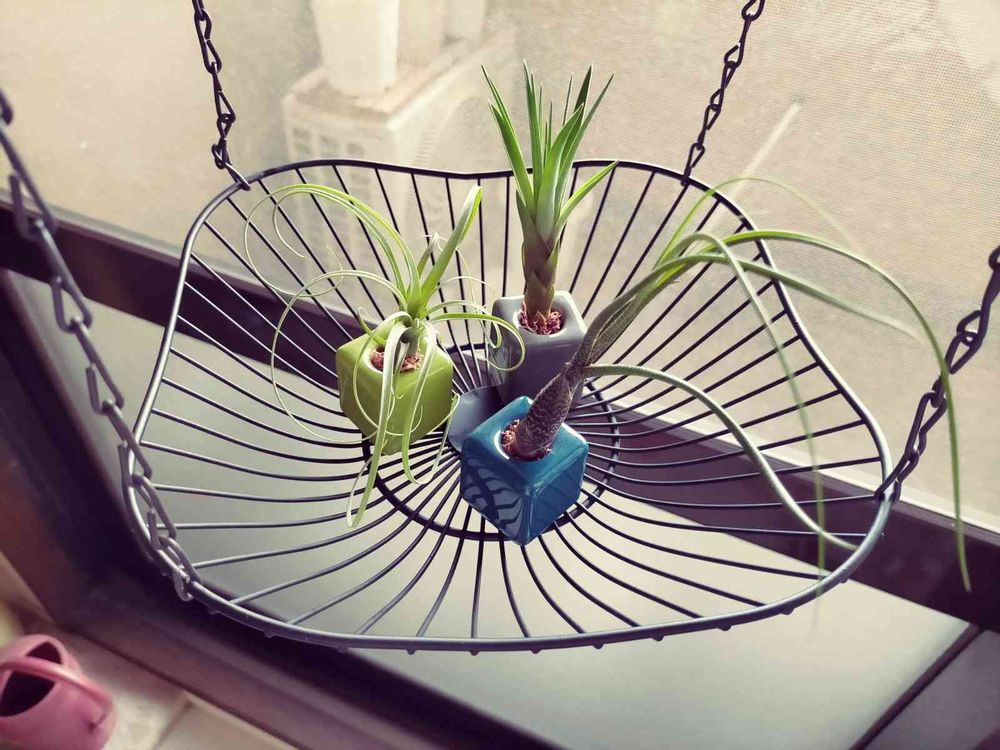 エアープランツたちを1個づつ水苔で巻いて固定してみた。セリアのカラー水苔は水で戻すとプルップルになって、いい仕事をする😃
