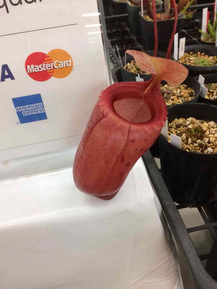 こちらはヒーローズピッチャープランツブースの入り口にあったのを許可を頂き撮影したN.シブヤンエンシスのピッチャーです。私の拳より一回り大きいくらいでした。ベントリコーサの近縁というだけあって葉の形やリップのつくり、ヒョロヒョロと伸びたツルなどが似ていたように思います。