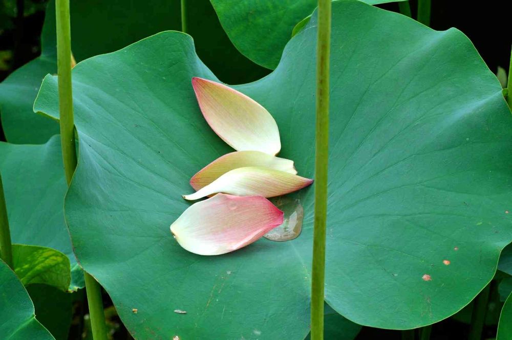 大きな蓮の葉に、大きな花びらがこぼれ落ちていました。
