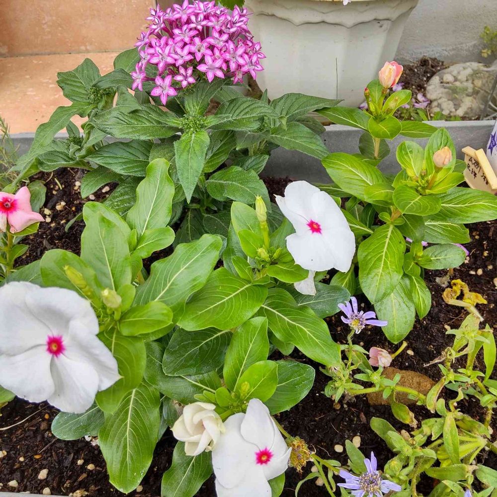 積み。ニチニチソウとペンタス。右端に庭で弱っていたデイジーを鉢に植替え。