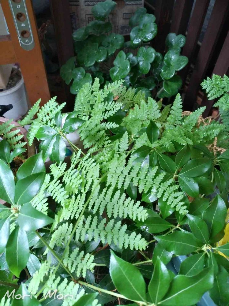 イワウチワの鉢に居候している謎のシダ、主人を押し退けてジャングル化してきました😅