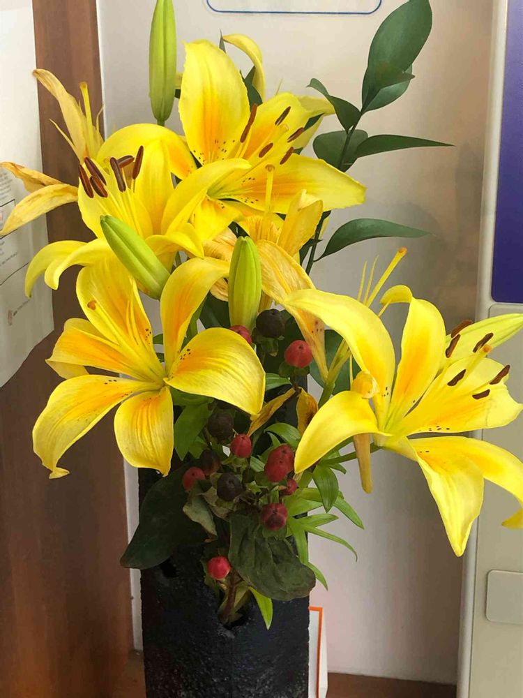 駅に元気が出るビタミンカラーのお花が生けてあるのはいいですね👍☺