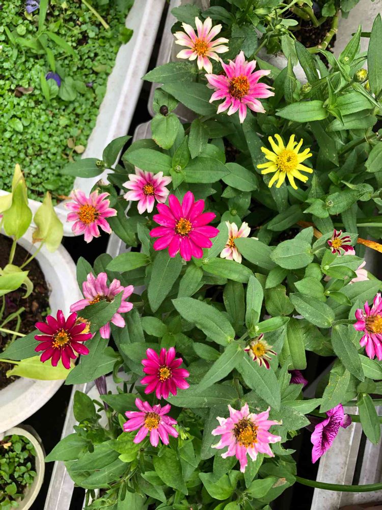 ジニアの色合いがまた変わって、縦横に広がって咲いてます。プランター選び間違ったかも😅