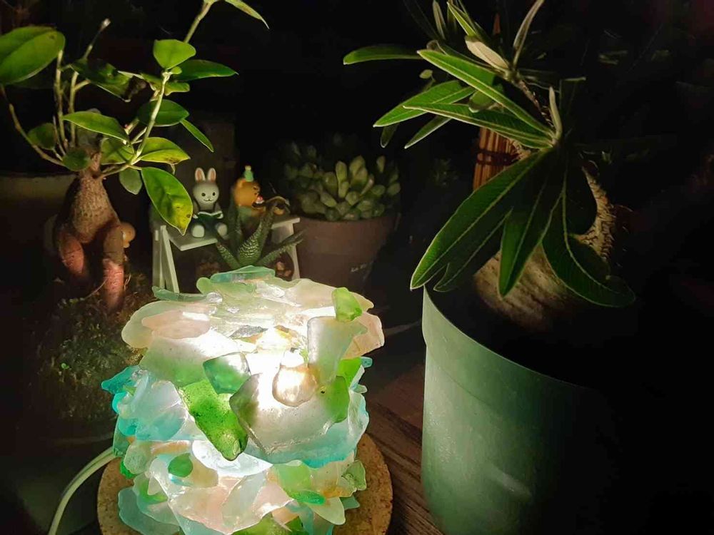 ちなみに、この照明さん、浜辺に流れ着いたガラス片を集めて手作りしました😚👍