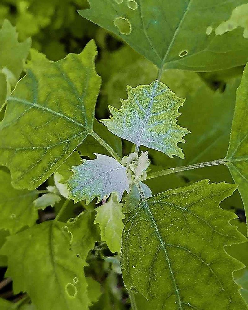 ヒユ科アカザ属の一年草。ユーラシア原産で古い時代に広く帰化したと考えられる史前帰化植物。同じく古い時代に中国から渡来した藜(アカザ)より早く渡来したと考えられる。縄文、弥生時代の住居跡の土器の中から種子が見つかっているので大昔から食料として利用していたことが分かる。畑や道端、荒れ地など至るところに生える。若葉は食べられる。若葉は白い粉状物に覆われ白っぽく見える。これは、葉の表面の細胞が球状に飛び出したもの。茎の下部の葉は菱状卵形~卵形、上部の葉は細長い。縁には不揃いの歯牙がある。花期は9~10月。花は黄緑色で小さく、穂状に集まってつく。花披片は花の後も残って胞果を包む。果皮の中の種子は直径1~1.3㎜の扁平な広楕円形で、黒くて光沢がある。
