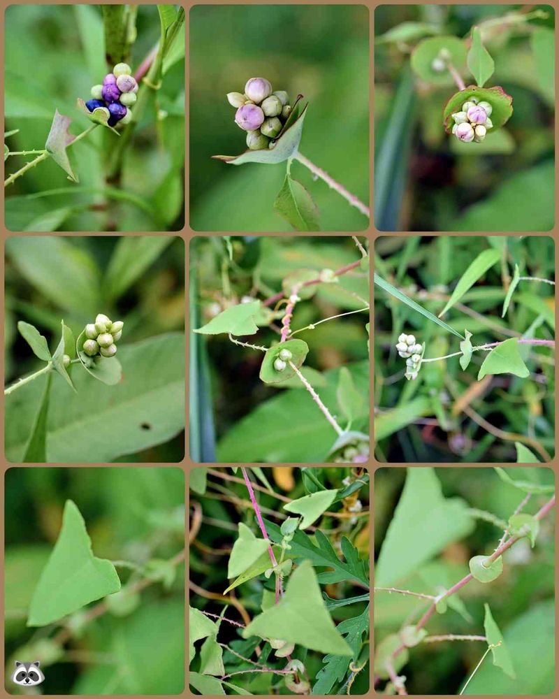 短い花穂が皿のような苞葉の上に乗るように付きますが、花には花弁が無く目立ちません。緑白色の萼が5裂していて、花が終わると萼片が多肉質になって果実を包みます。この萼片が緑白色から紅紫色、青藍色へと色が変わります。