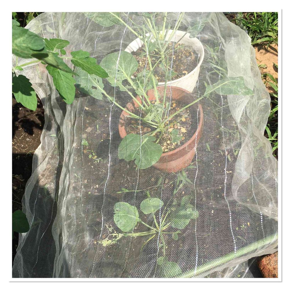 あおむしに葉を食われまくるので、地植えの芽キャベツの横に鉢植え2つを並べて、遅ればせながら簡易防虫ネットをはってみた。モンシロチョウ避け。あおむしいたら取り除く。