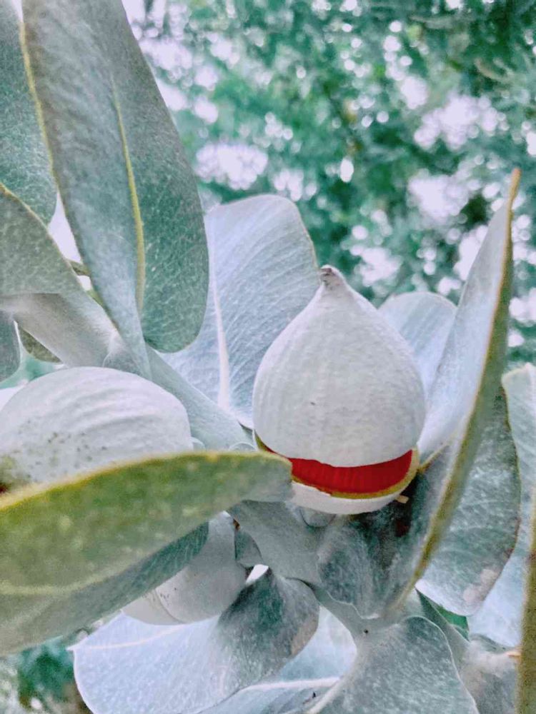 三つ子ちゃんの1つの帽子がパッカン。マクロカーパ連日ですが、三つ子はそこまで太ってませんでしたが開きました✨✨お帽子とれたら花が咲くよ❤️ マクロが続きますが一人でもチラ見してくれたら珍しいので嬉しいな。この子達も10ヶ月以上蕾でした。ユーカリは大概1ヶ月くらいで咲きます。ユーカリの中で最も大きな花を咲かせるので時間がかかるんですね!