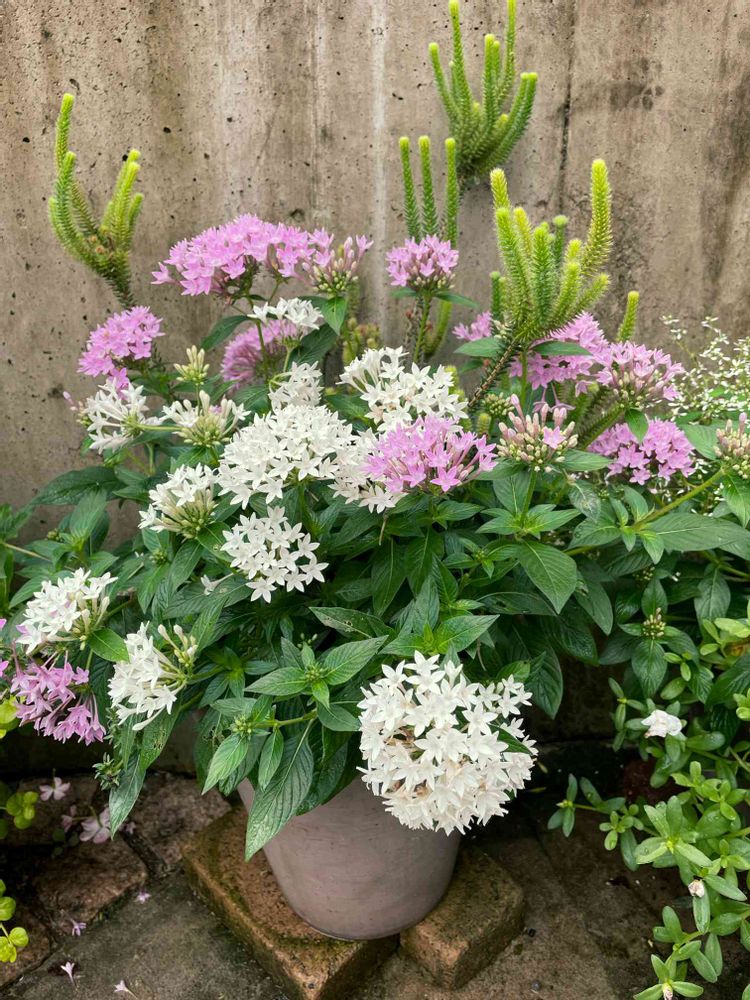 白とピンクがかった薄紫のペンタス、昨年の秋に使ったエリカを使い回し❣️