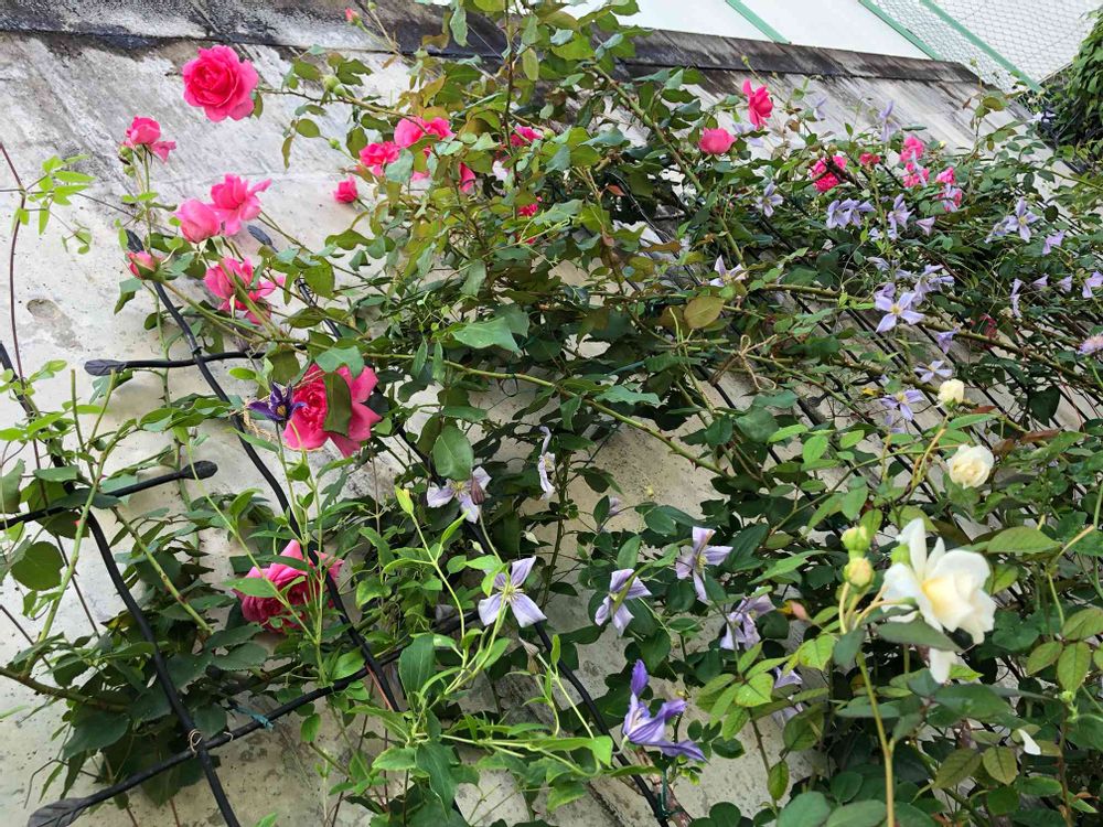 くろまるぷーさんの クレマチス,バラとクレマチスのラチス,坂道花壇の投稿画像