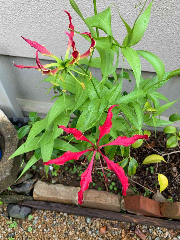 咲きましたね、ねこミーのグロリオサはまだようやく葉が巻き付き出したくらい蕾はまだ見えませんよ〜
