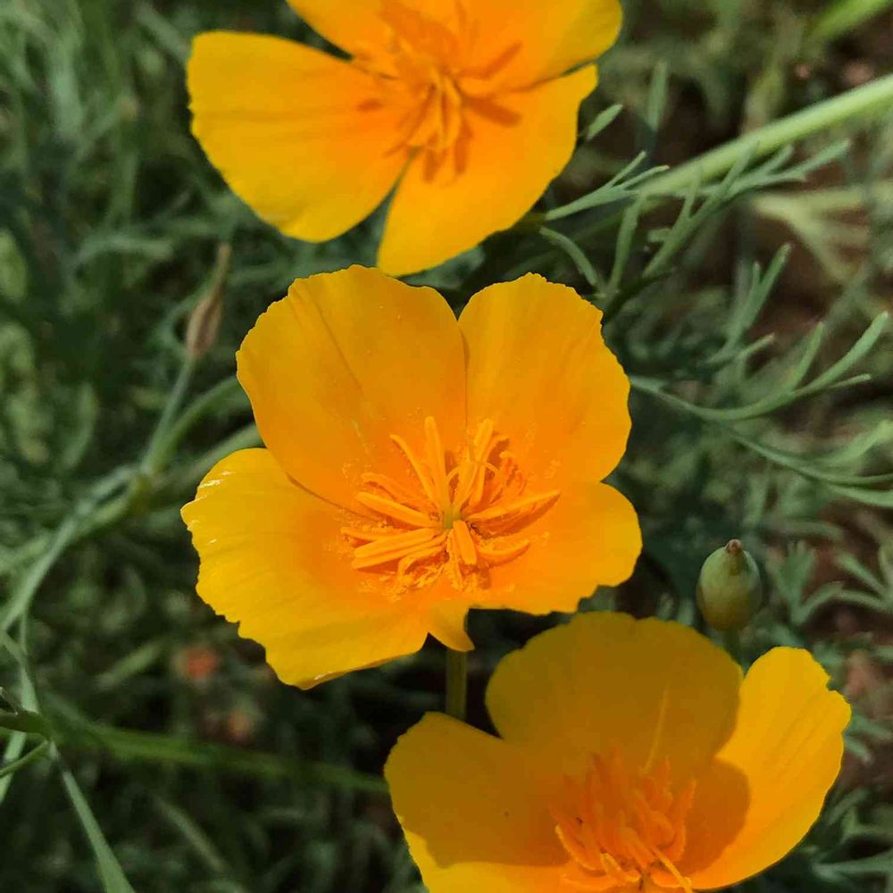 昨夜の雨でちょっと横倒れになってしまったハナビシソウのお花…仲良く並んで咲いています🧡💛🧡