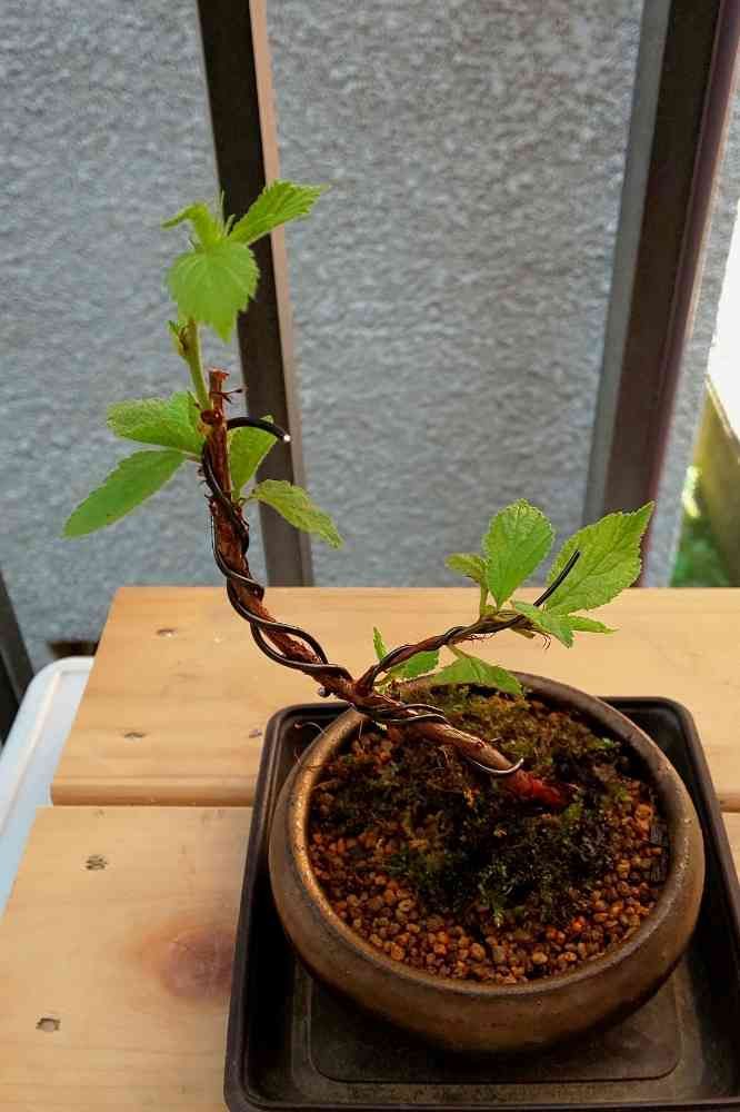 実生二年めのユスラウメ、大きめの鉢でのびのび育っていたのを盆栽にしてみました。