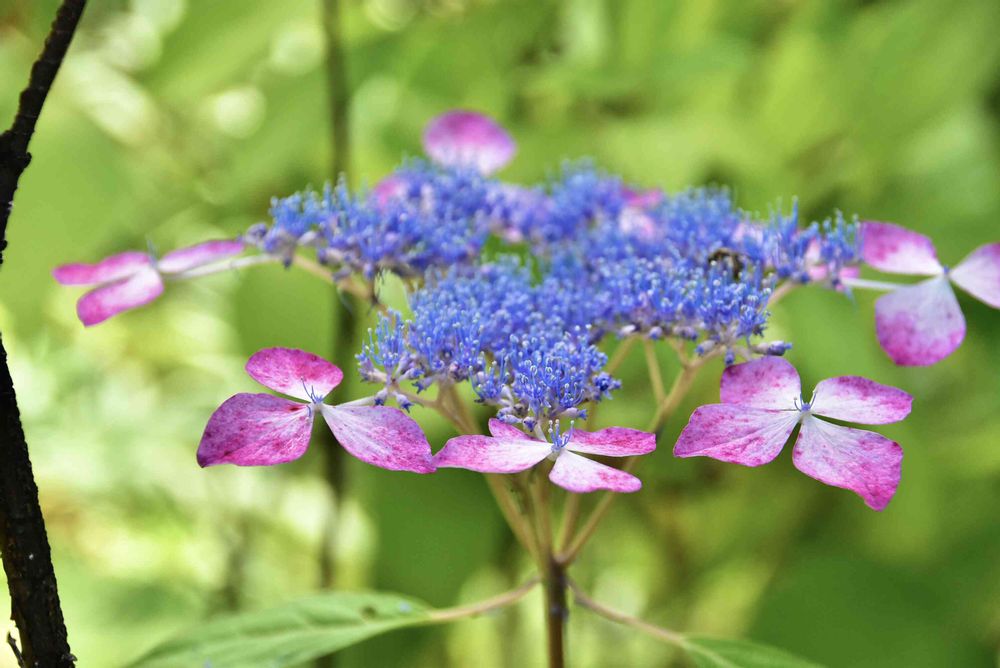 ブルーの両性花を取り囲む、淡い紅色の装飾花、自然の中にあるととっても素敵な配色ですよねえ💕