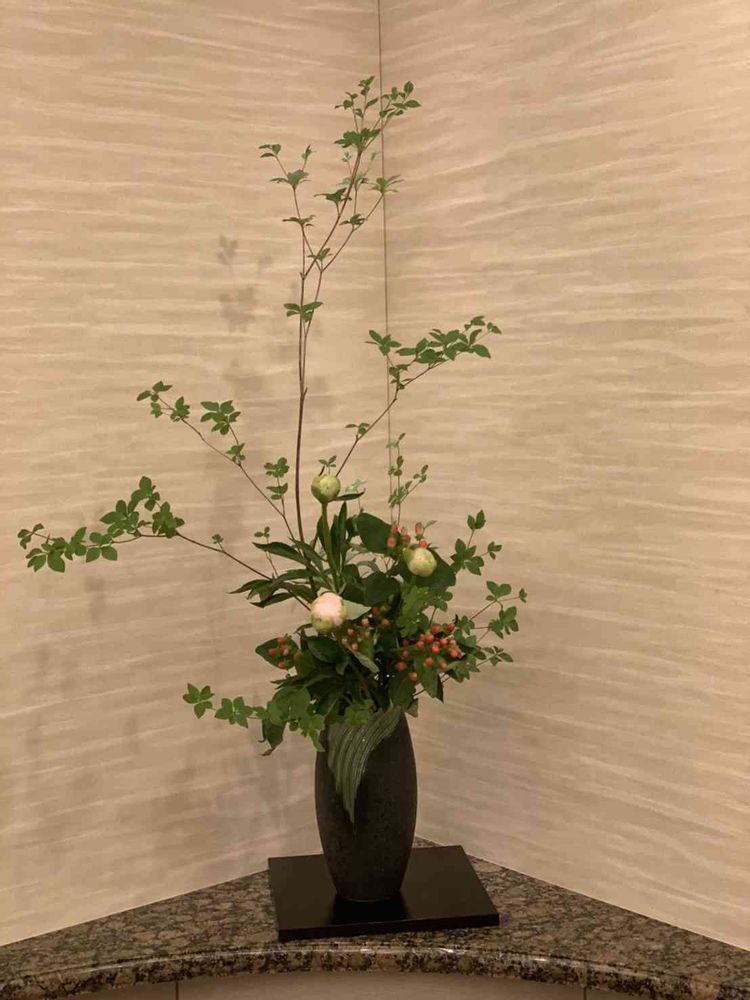 根元も芍薬とヒペリカムで締めてスッキリ、素晴らしいです❣️