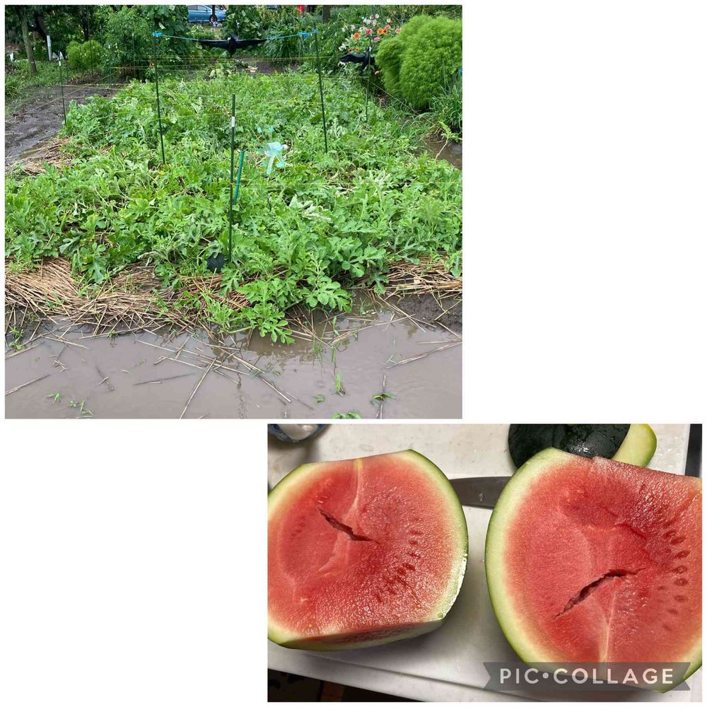 スイカは去年、長雨の後、急に晴れて真っ白に日焼けして残念な事になっちゃったので今年は昨日、今日と急に太陽が出てきたので葉っぱや藁で隠しましたが、嵐はどうにも葉っぱもぐったりで、よく見たら👀スイカの成り元のヒゲが急に枯れたので収穫しちゃいました😅切ってみたらOK😋😋早速冷蔵庫に入れて今夜のデザートで😋😋😋😋😋ヤッター😋😋