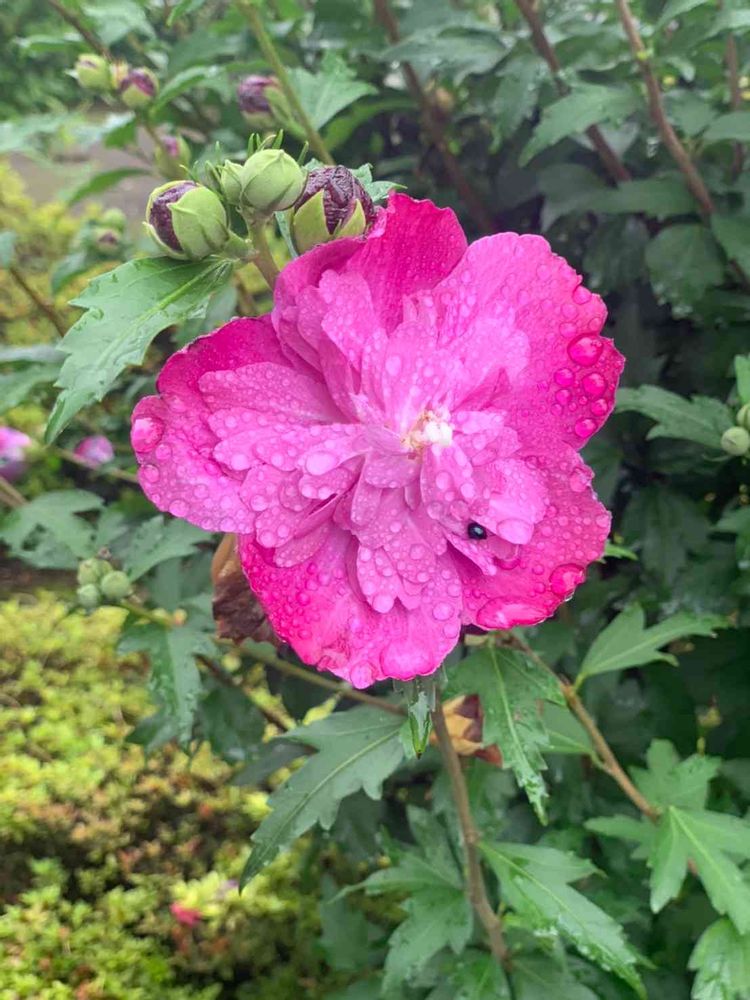 こんにちは先ほど雨上がり場所によって氷結が降ったそうです友人より❗変な天気ですね皆様どうぞお気をつけてお過ごし下さいし🙇⤵️雨上がりの八重木槿に🐞⁉️違うね🤣