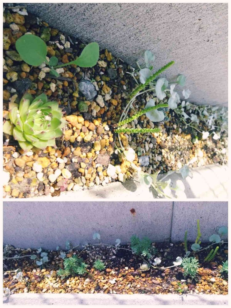 駐車場の隙間に地植えした方々(雑草もいる笑)。