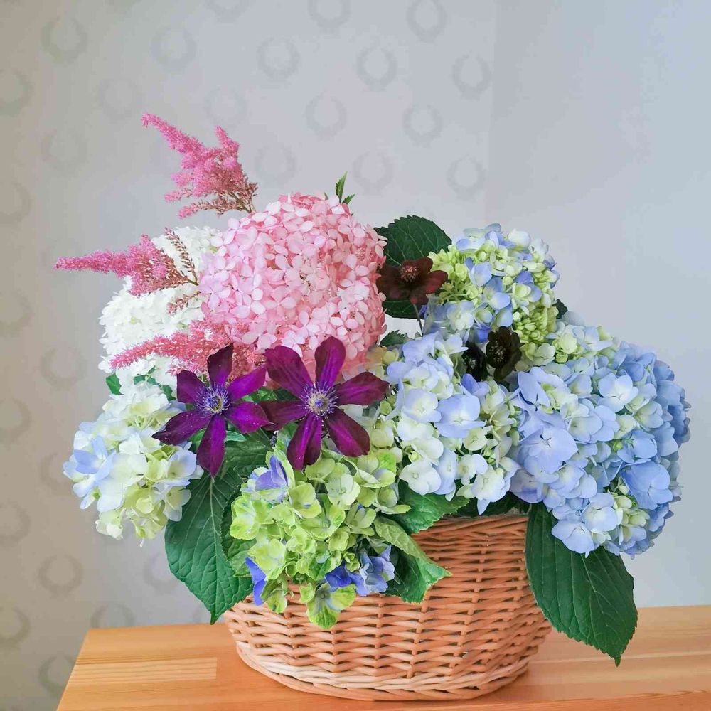 咲き始めの淡い紫陽花と、強い色のクレマチス&コスモスでアレンジしてみました|•'-'•)و✧
