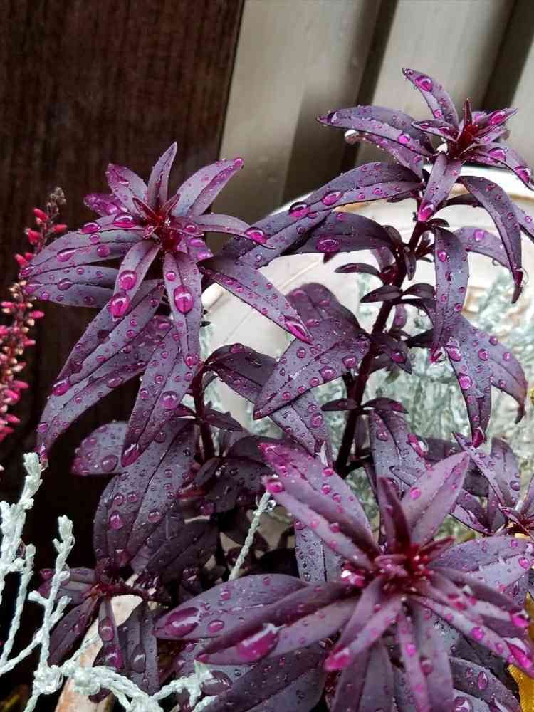 寄せ植えのキンギョソウ、滴まで紫色😍❤