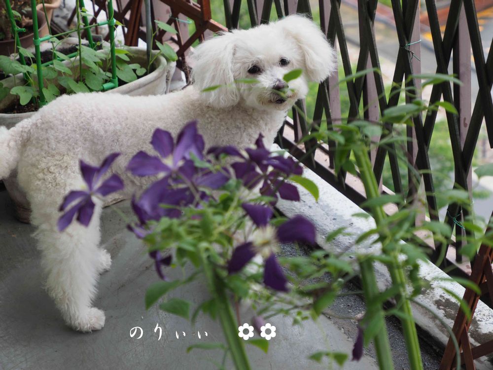 紫色💜のクレマチスと真っ白🤍のワンちゃんのコラボが素敵です😍😘💕