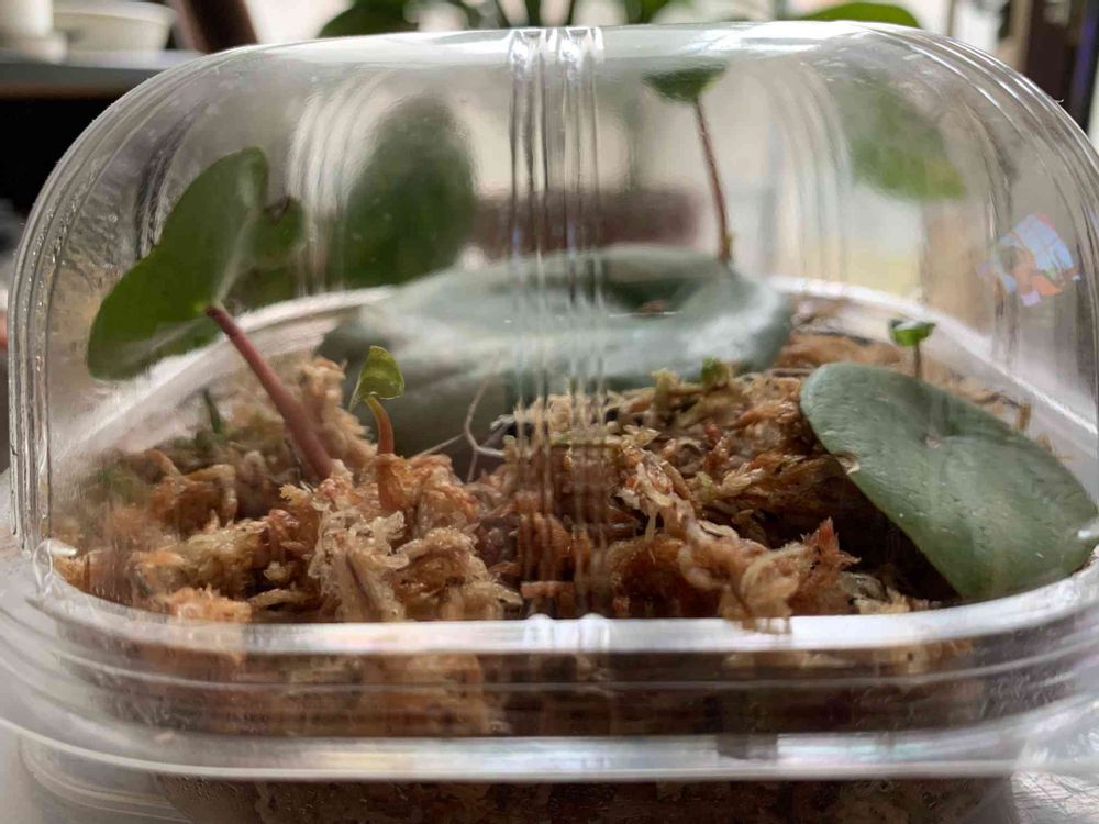 マリトッツォが入ってたプラケをスイカぺぺの保育器にしたら、ベビ葉出てた🤡