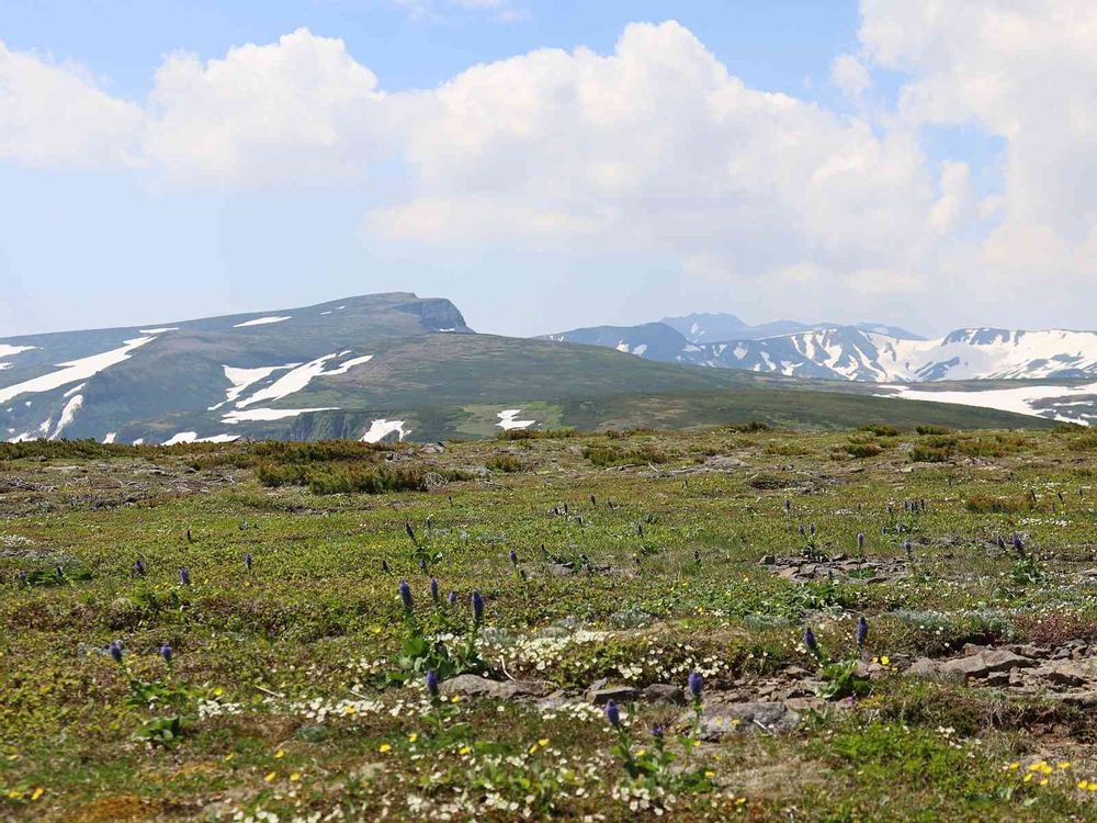 ホソバウルップソウの群生地の後ろに見える山は忠別岳、トムラウシ山、化雲岳