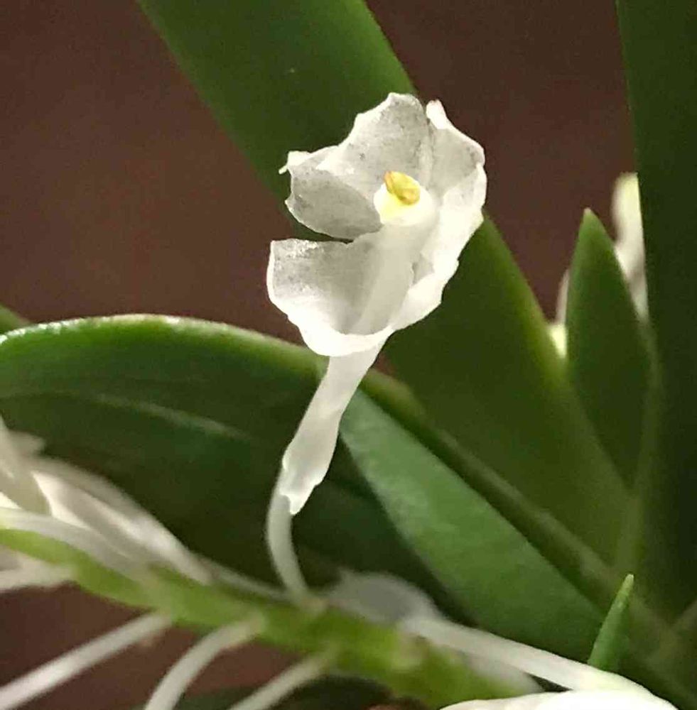 セパル、ペタル、大きなリップ、花粉塊、長い距の底には蜜があるのかしら?西アフリカの着生ランです