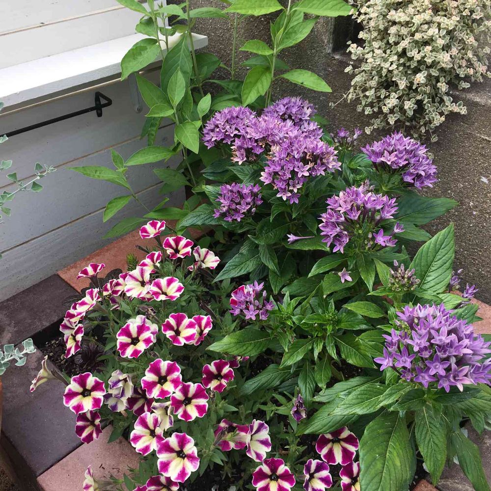 ペンタスとスーパーチュニア ラズベリーチーズ 小さな花壇で咲いています
