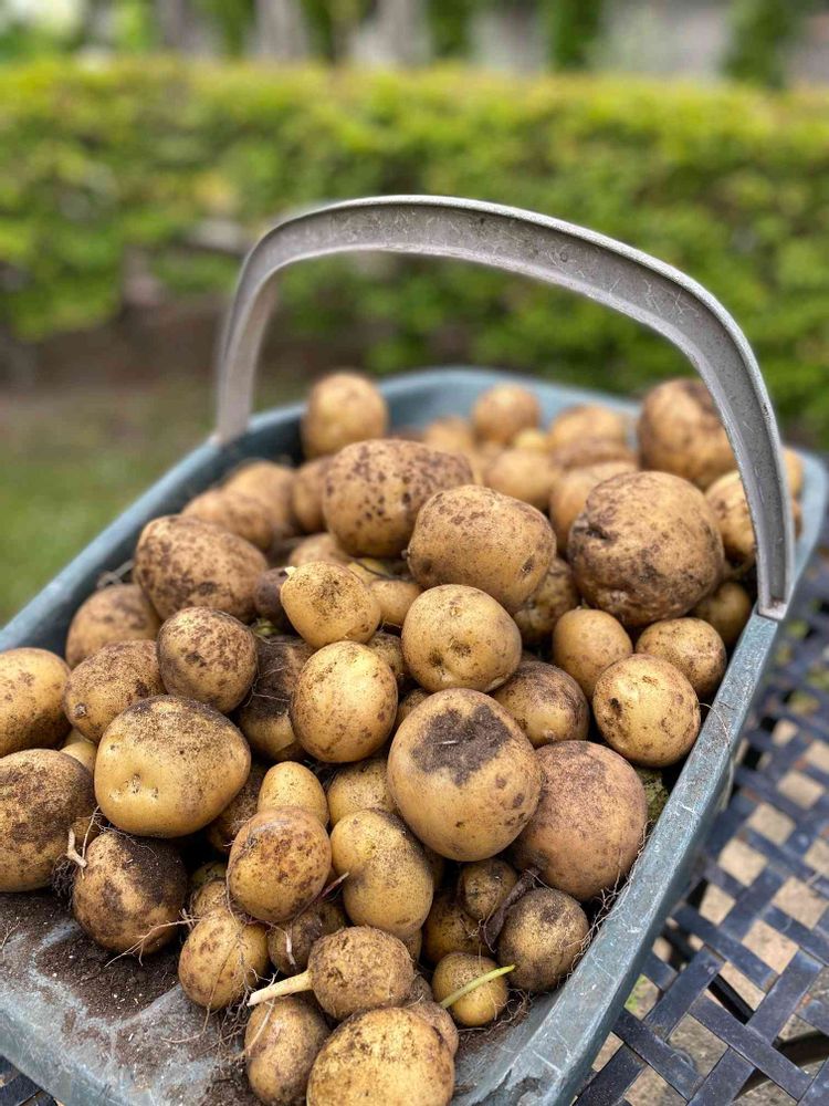 早く収穫したいので、室内で大きめの黒ポットで育成してから、地植えしていたジャガイモ🥔