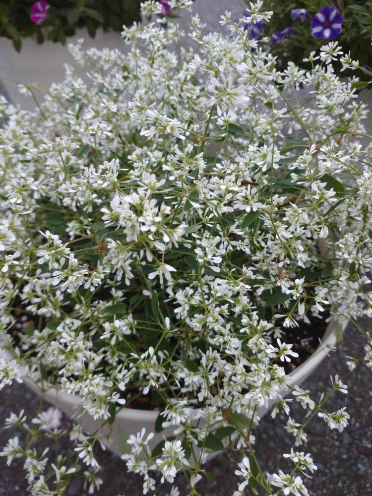 白なので何色の鉢の隣りに置いても合うし雨に濡れても大丈夫な万能なお花😊
