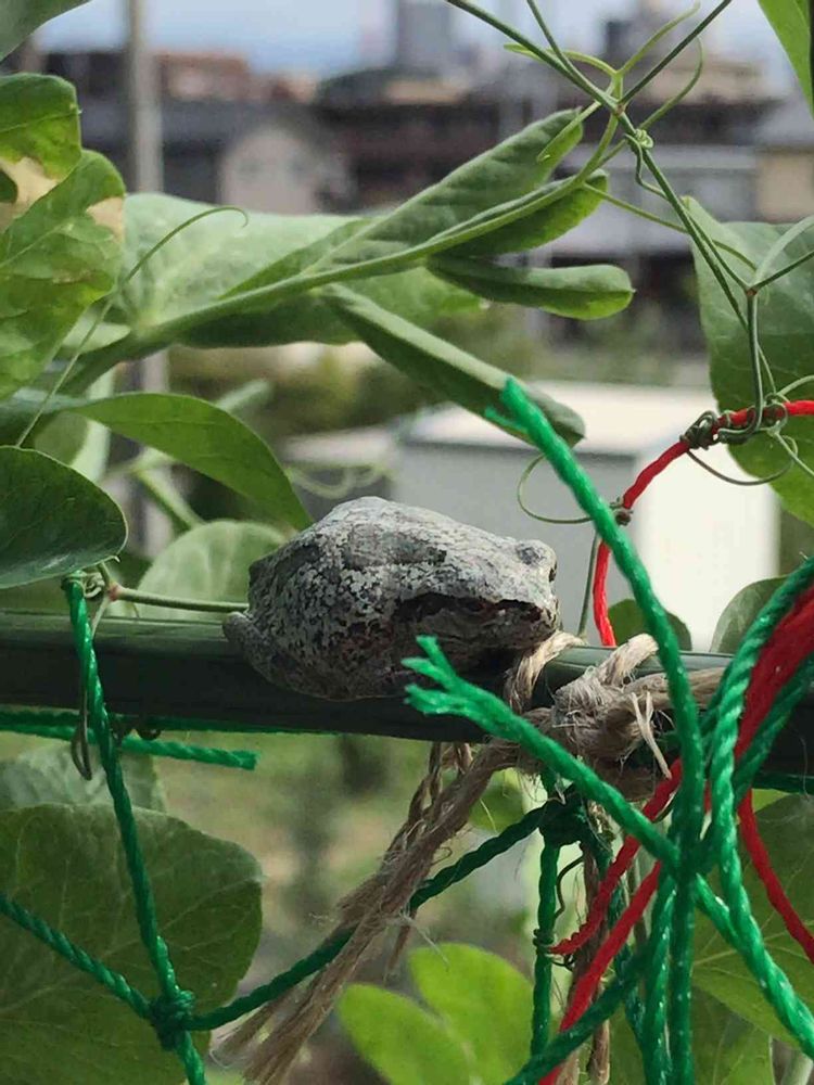ベランダプランター栽培を始めて6年目になりますが、毎年カエル🐸が出没します。2種の🐸です。今年もうどん粉病の絹さやを抜いて片付けようとしたら毎年遊びに来るこの🐸とこんにちはをしてしまいました😅