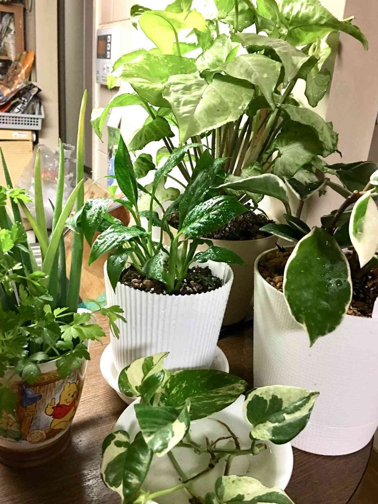 キッチン周りは 日陰で 大丈夫な お嬢様ばかりですが 台所に立つたび 霧吹きしながら こっちも 気持ち潤してもらっています。👍💕