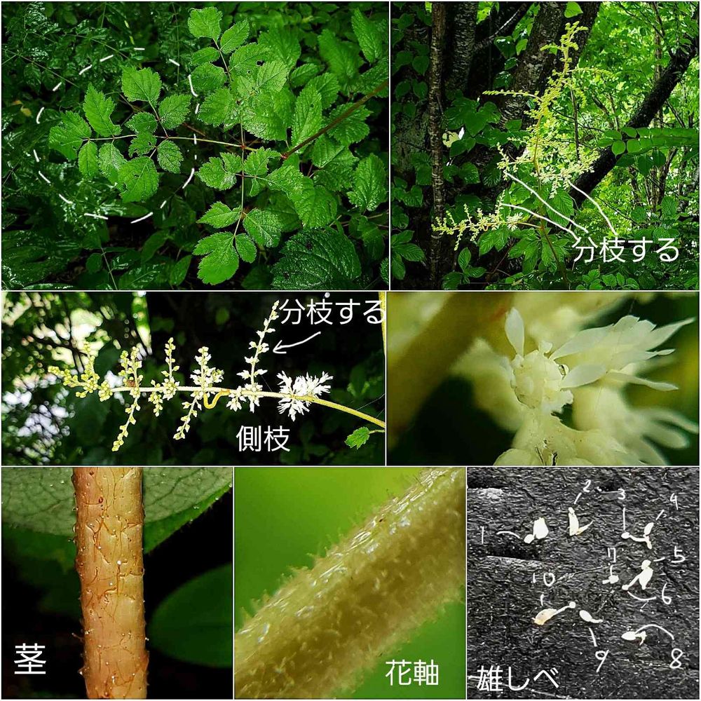 今回のトリアシショウマと思われるものは山地にて撮影したもので、側枝は分枝して、葯はクリーム色を帯びて、花軸には開出毛がありました。多少べたついたので腺毛もまざっていると思いますが、先日のチダケサシの花軸には水玉のような腺を先につけた毛がたくさん生えていましたので、それと比較すると明瞭とは言えない気がします。ただ、個体差もあると思うので一概には言えません。