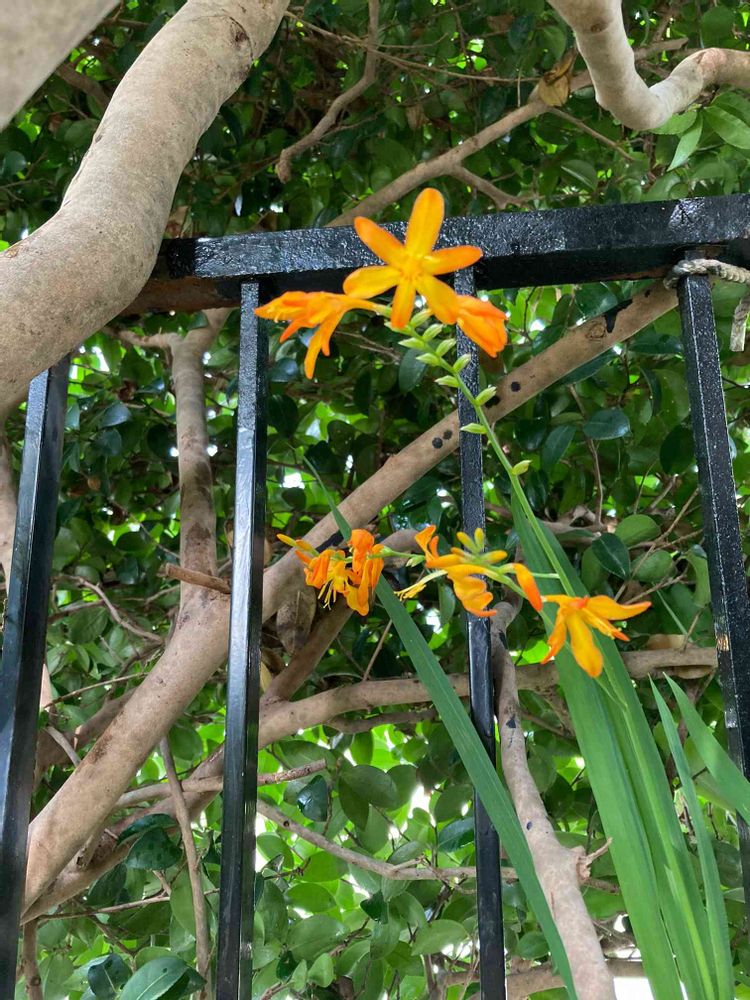 も一つビックリはクロコスミアの薄いオレンジ🧡いつ我が家に⁉️垣根の下にひっそりと咲いていらっしゃいました‼️最近誰に貰ったのか?それとも買ったのか❓思い出せなくてーなるべくラベルに書いて刺しておくようにしてるのですが・・(~_~;)