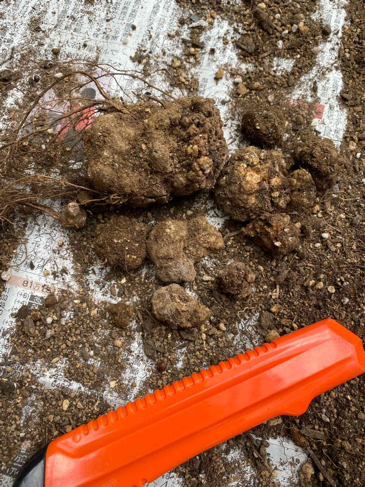 根っこにもいくつかあり疑わしいものは全て取り、切った所は木酢液を塗り込んで 新しい土にして戻しました。