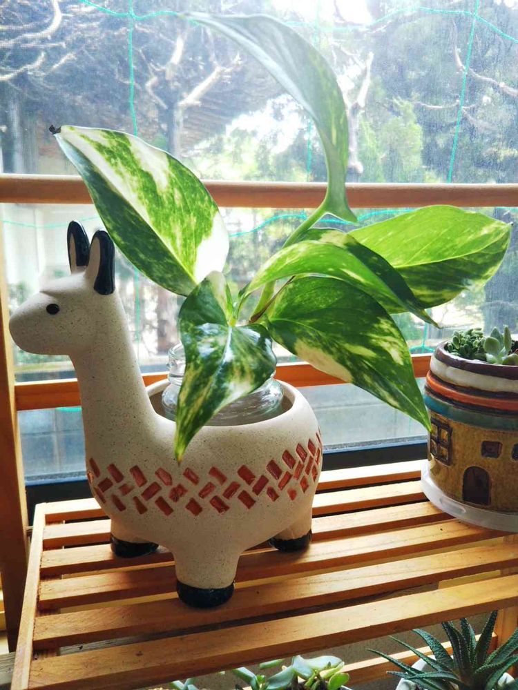 元はガジュマルが入っていたアルパカ鉢(器)、発根するまでポトスの水挿し瓶を入れておくことにしました 🌿