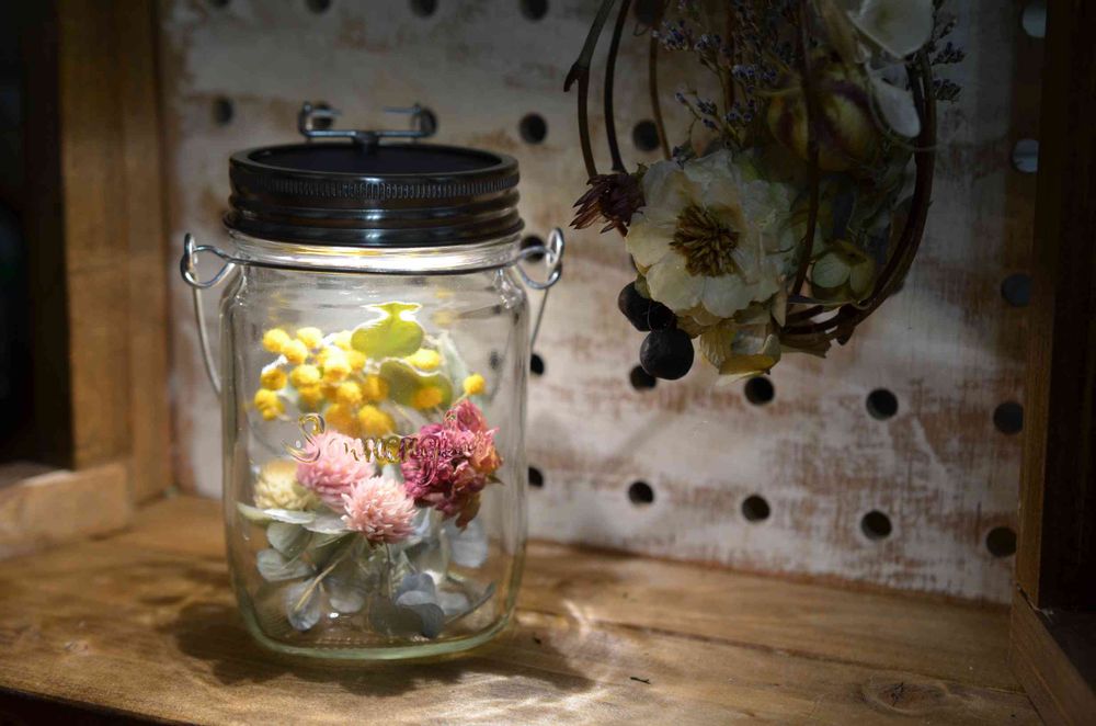 今回紫陽花、ミモザ、などのドライフラワーを入れたけど、貝殻やガラス玉とか