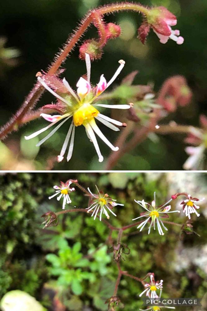 ユキノシタの特徴的な下に伸びる2つの花弁が、雄しべそっくりに変化した、筑波山にだけ生育する固有種です😍