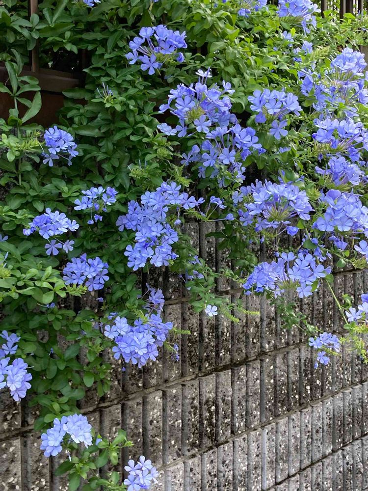 ご近所さんのブルーの花がとても綺麗です。フェンスからはみ出て下に垂れ下がってます。