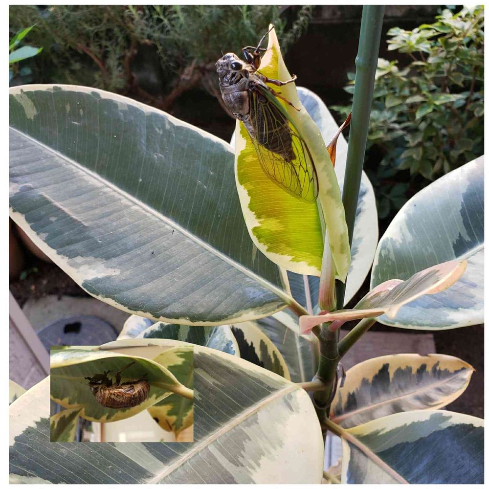 昨夜、セミの幼虫を庭で見つけゴムの木に乗せましたが木から落っこちて心配していました😓